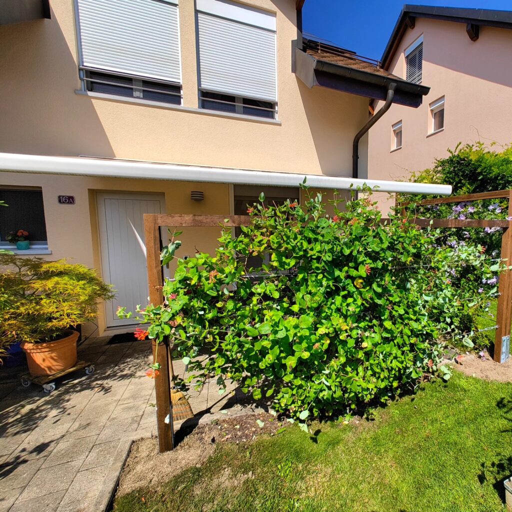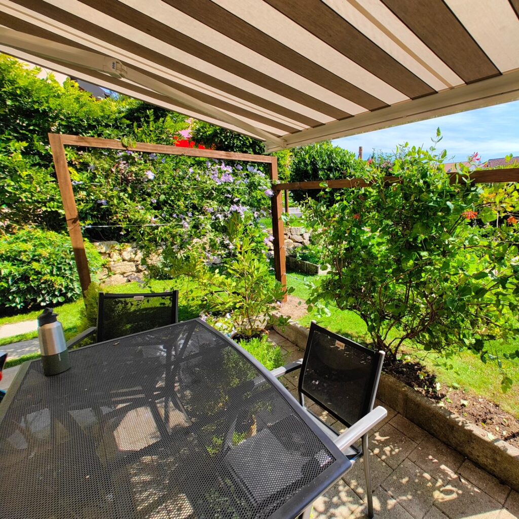 Extension d’une terrasse existante. Remplacement du chanfrein en béton par une bande drainante en gravier, bordurée en aluminium. À Rolle.