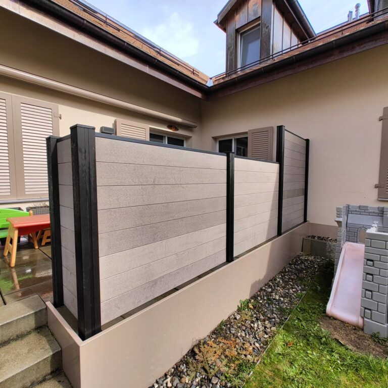 À la demande des nouvelles directives écologiques de la ville de Lausanne. Plantation en bacs de Glycines et végétalisation de la toiture avec des tapis
