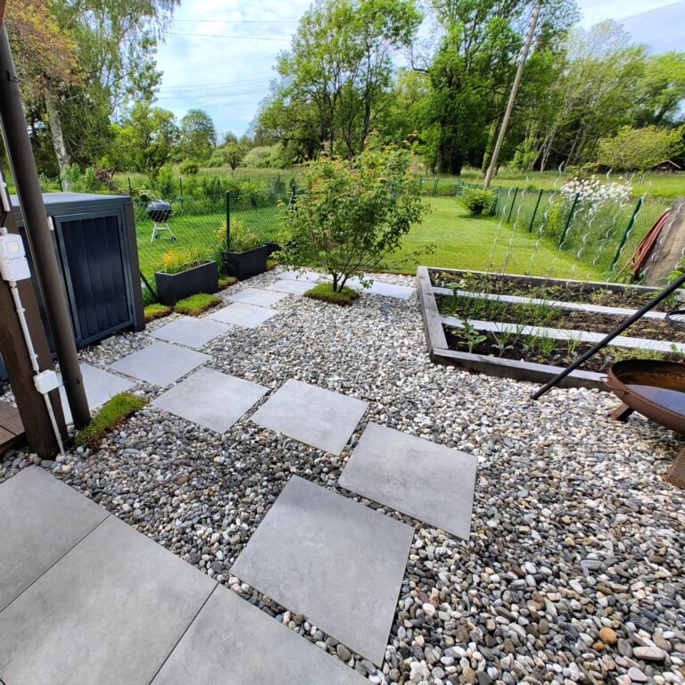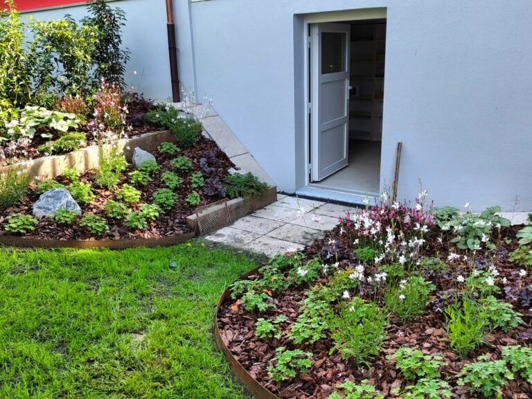 Un superbe Euonymus alatus planté en fin d’année 2024. Chêne, acier Corten, pierres de St-Léonard et écorces de Pin, pour un espace de vie sur