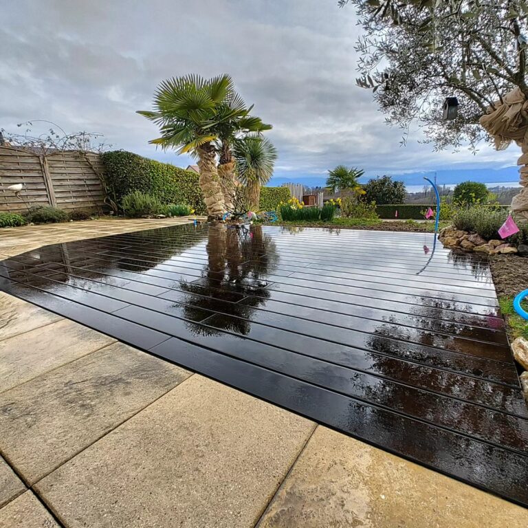 Réfection d’une parcelle de gazon abîmée par les travaux d’installation de pompe à chaleur. Nos équipes s’occupent du suivi d’arrosage dès la fin du semis,