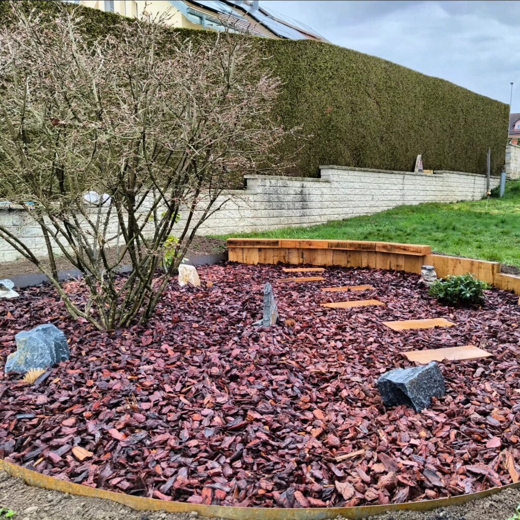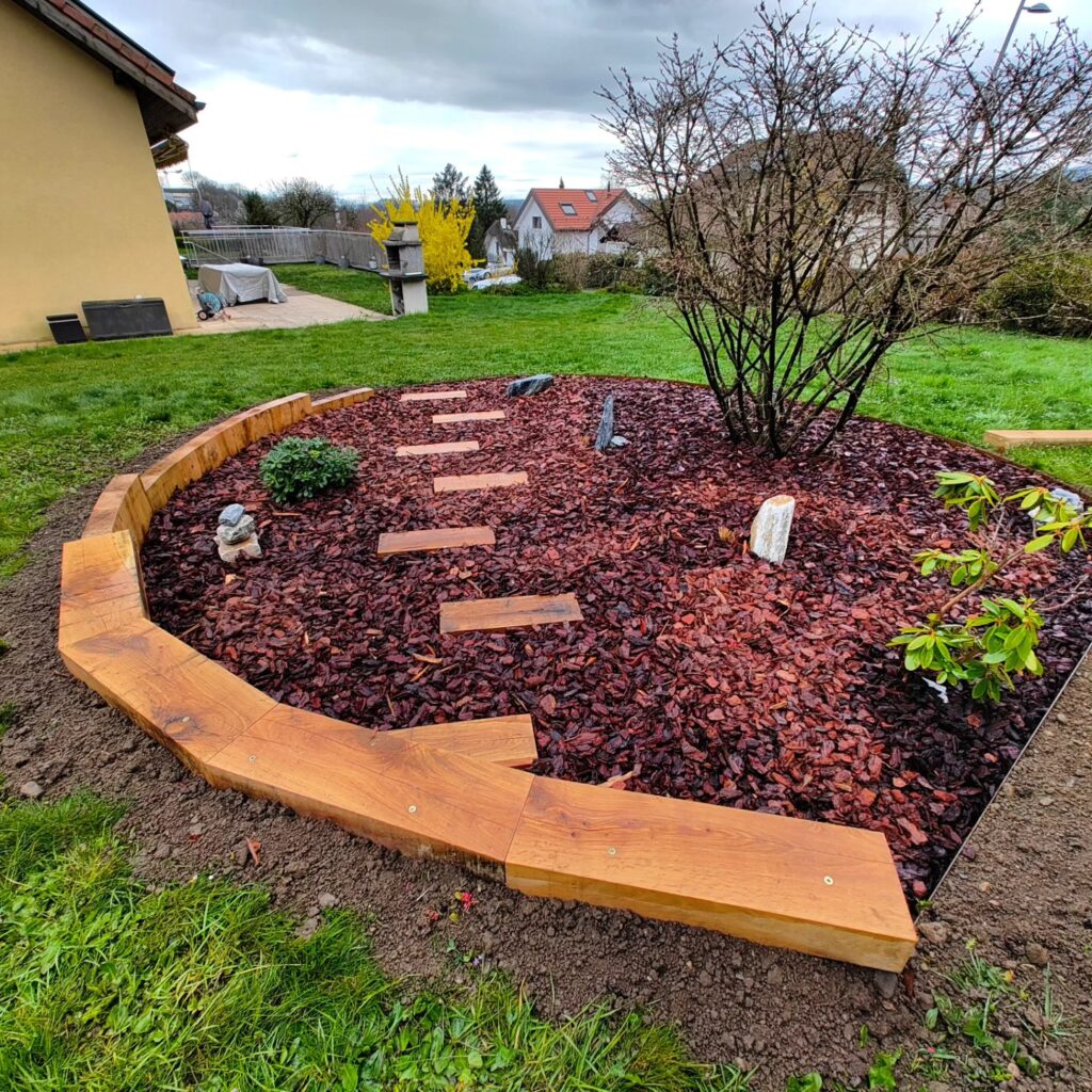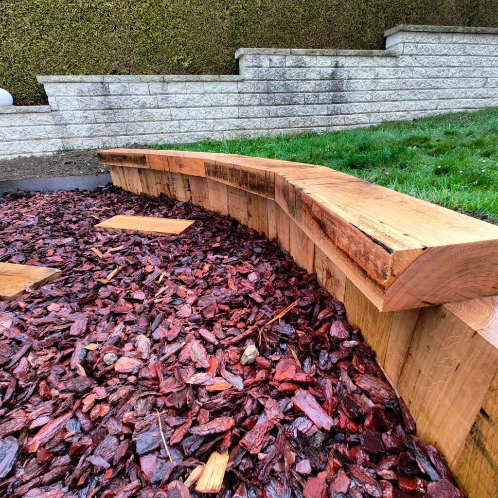 Chêne, acier Corten, pierres de St-Léonard et écorces de Pin, pour un espace de vie sur mesure et personnalisé.