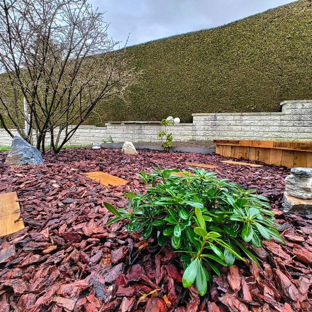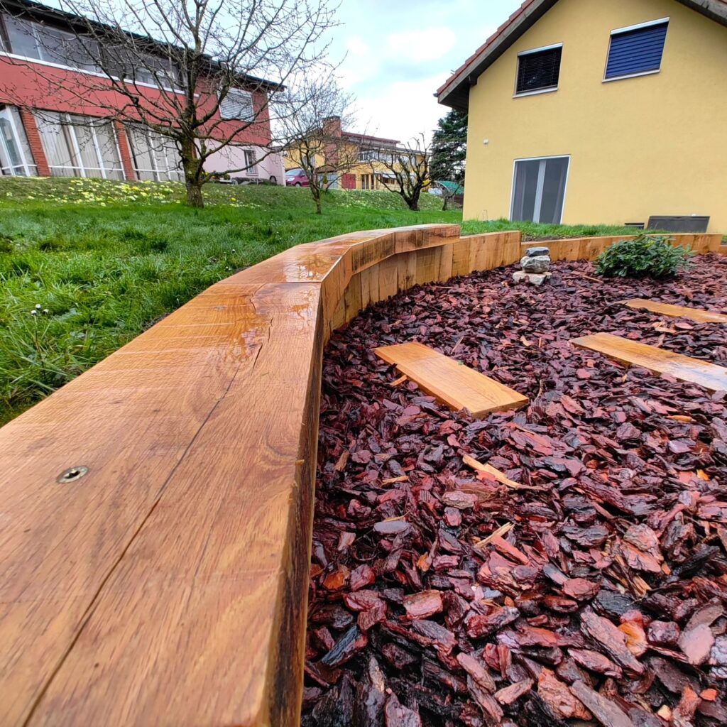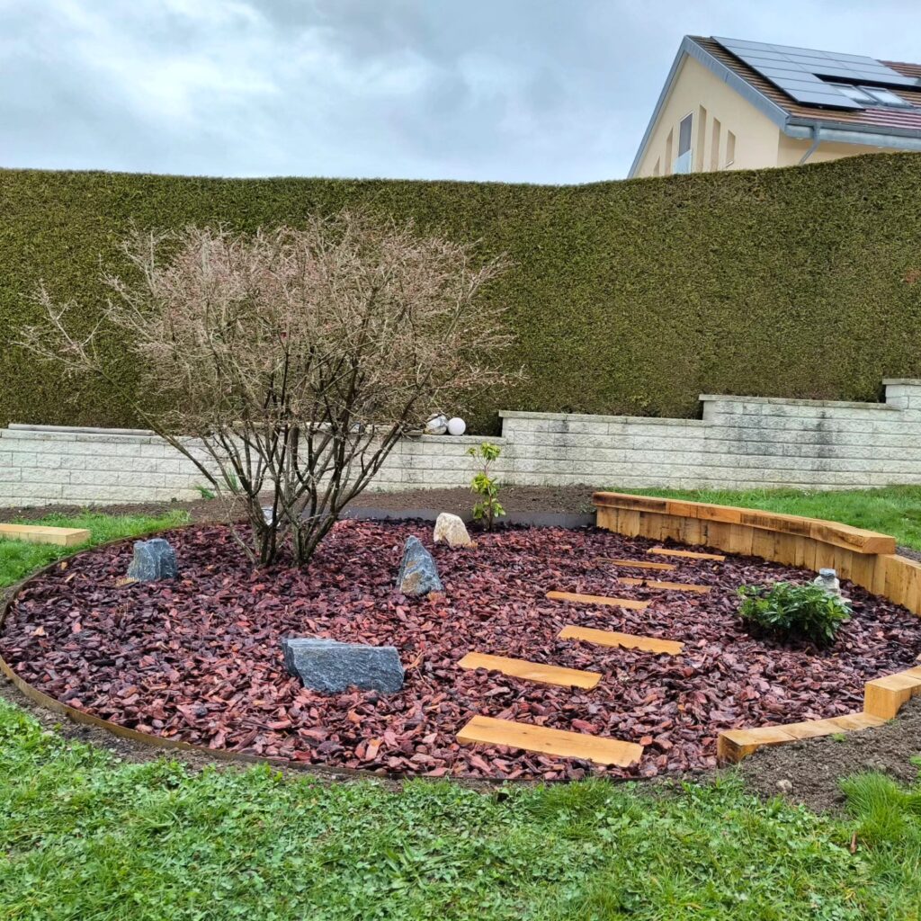 Chêne, acier Corten, pierres de St-Léonard et écorces de Pin, pour un espace de vie sur mesure et personnalisé.